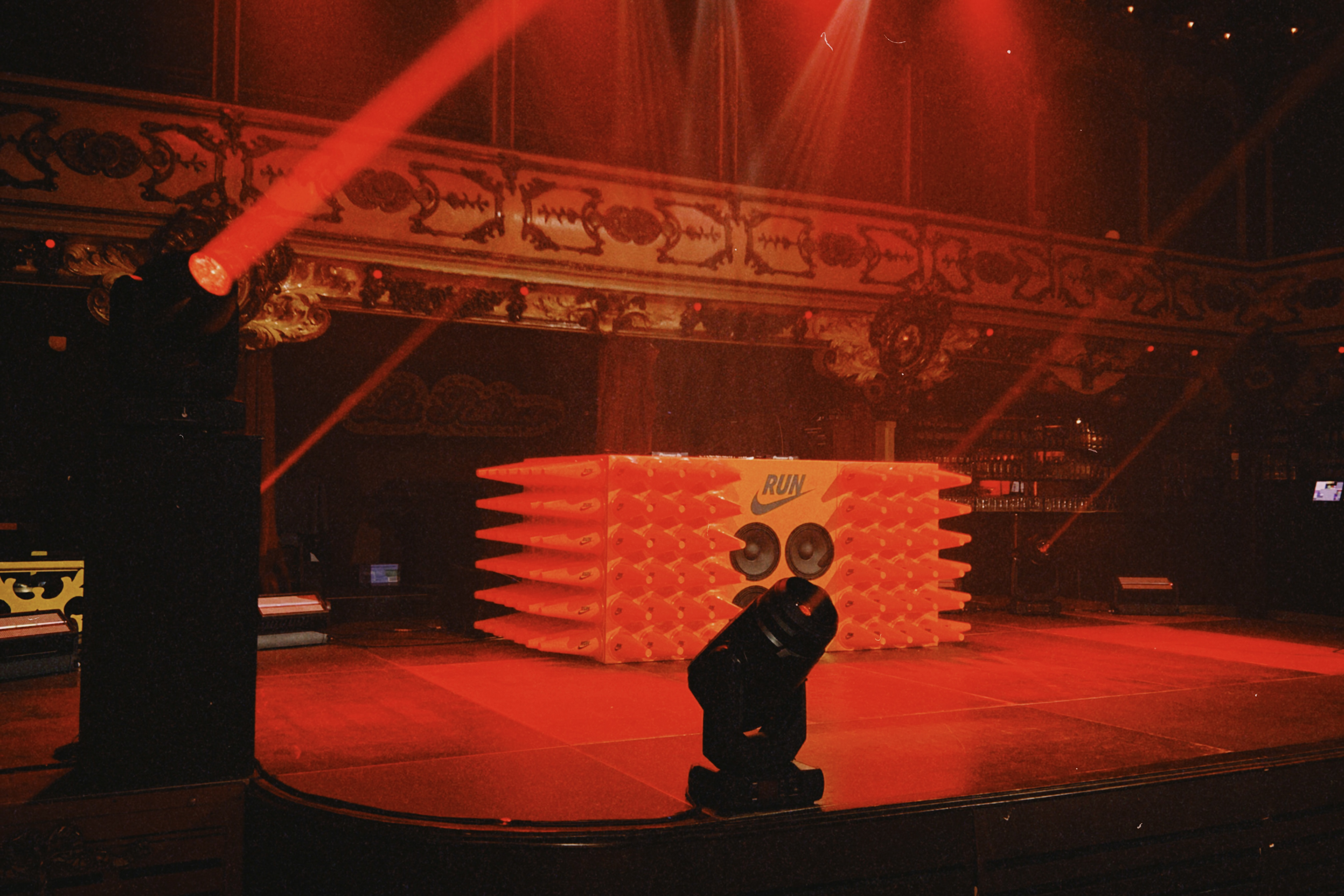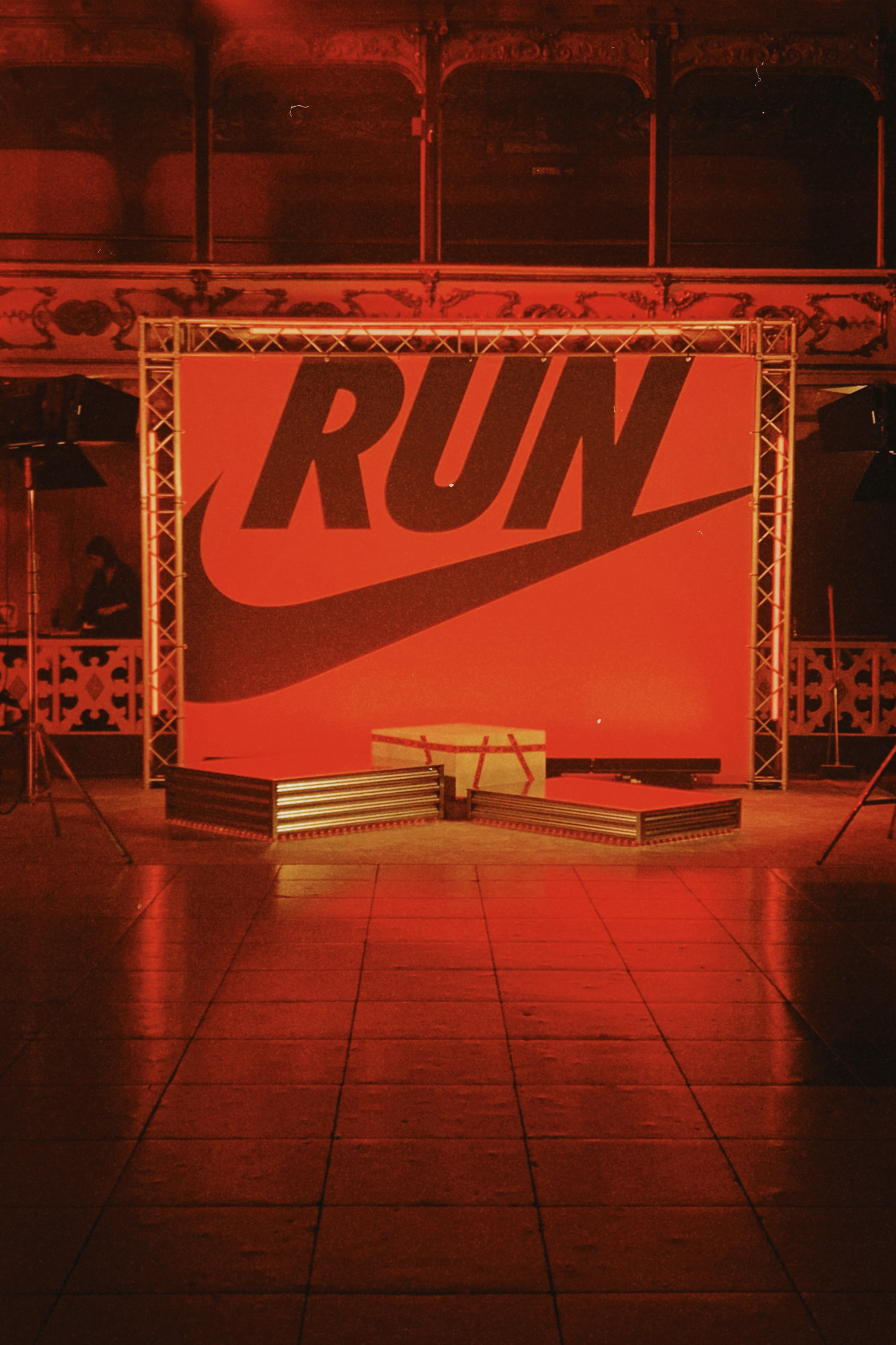 Production of the Nike run finish line art and entertainment installations in a former dance hall in Barcelona.